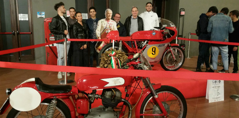 Sotto la guida del socio Cavec (Club Amatori Veicoli d’Epoca Cremona) Flavio Cocconi, gli studenti del professionale, che frequentano Meccanica con indirizzo Manutenzione mezzi di trasporto, hanno così avuto l’occasione di osservare da vicino la nascita e l’evoluzione della motocicletta dagli esordi del secolo scorso fino alla fine degli anni ’50, senza trascurare la leggendaria Vespa, presente in Santa Maria della Pietà con esemplari dal ’50 al ’65. Non sono mancati selfie accanto alla sagoma a grandezza naturale di Giacomo Agostini posizionata vicino alla Agusta MV500 3 cilindri con cui il pluricampione vinse il Mondiale nel ’71.