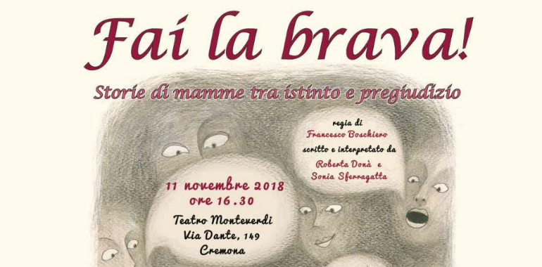 L’organizzazione di Volontariato Mammalia Onlus, organizza per la giornata di domenica 11 novembre (ore 16.30), presso il teatro Monteverdi di Cremona lo spettacolo teatrale dal titolo Fai La Brava – storie di mamme tra istinto e pregiudizio.
