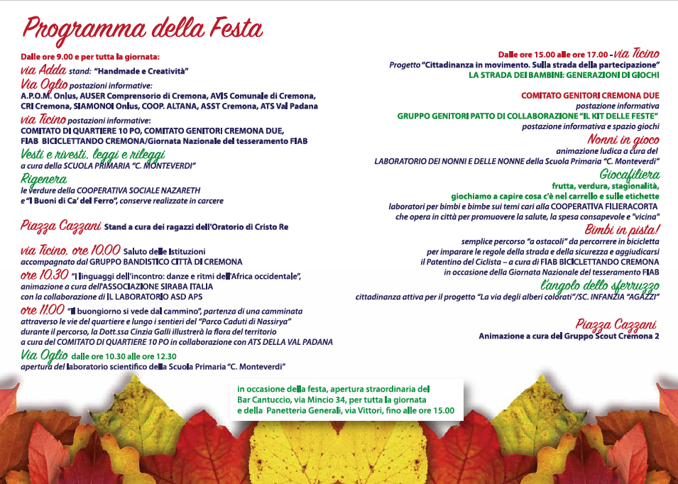 Alla manifestazione in programma domenica 11 novembre fanno da corollario due iniziative. La prima, alla Coop di via del Sale dove, dal pomeriggio di venerdì 9 fino a domenica 18 novembre, sarà allestita l’esposizione fotografica realizzata nell’ambito di ‘Quartiere in fiore’ (prima edizione 2018), concorso di addobbo floreale indetto dal Comitato di Quartiere 10 tra la primavera e l’estate scorse. Coop Lombardia, con il Comitato soci di zona Cremona ha infatti deciso di riallestire la mostra già realizzata a settembre in occasione della premiazione dei vincitori.