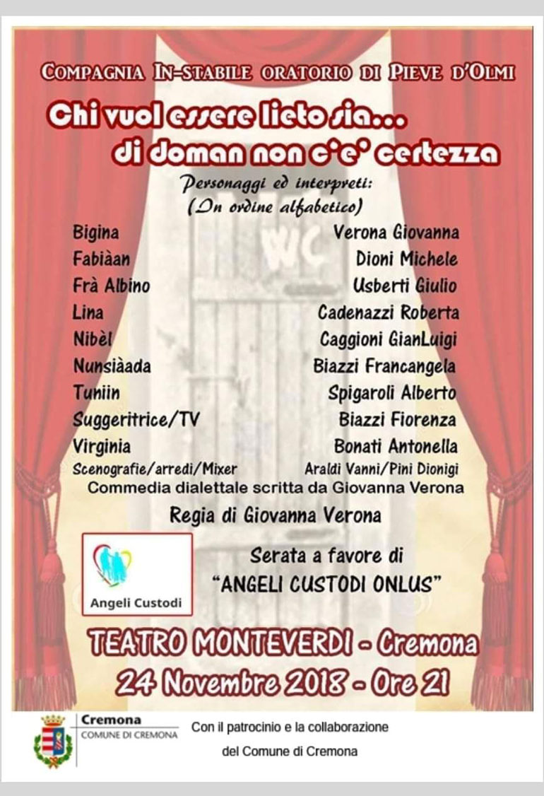 Una serata di sano divertimento quella in programma per il 24 novembre al Teatro Monteverdi, quando andrà in scena la commedia dialettale ‘Chi vuol esser lieto sia… del doman non c’è certezza’, con la compagnia teatrale InStabile dell’oratorio di Pieve d’Olmi.