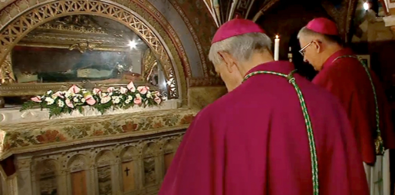 Dopo l’accensione dei ceri votivi il Vescovo Napolioni ha guidato la lettura della preghiera per il Santo Patrono prima di lasciare la cripta per la celebrazione in Cattedrale.