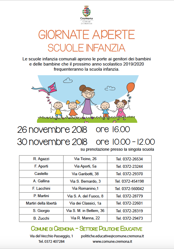 Gli open day si terranno in tutte le nove scuole infanzia comunali con le seguenti modalità: il 26 novembre, alle 16.00, in ogni scuola, le insegnanti presenteranno ai genitori l’organizzazione della scuola, il progetto formativo e spiegheranno come l’organizzazione degli spazi possa facilitare l’autonomia, la conoscenza e la socializzazione. Il 30 novembre, dalle 10.00 alle 12.00, è possibile prenotarsi nelle singole scuole per una breve visita agli spazi durante le attività educative.