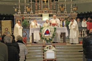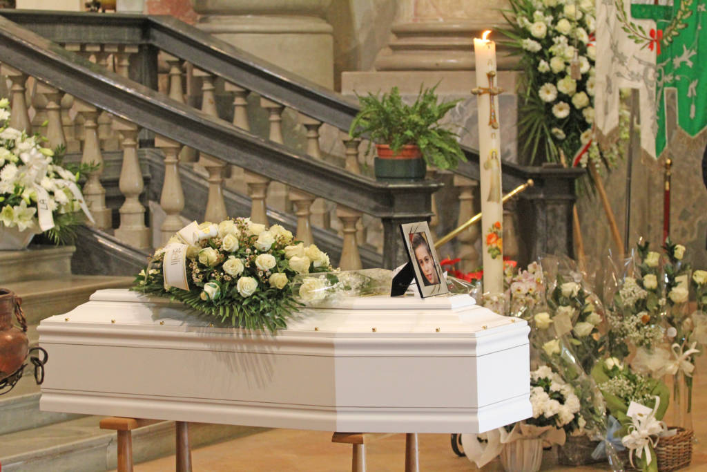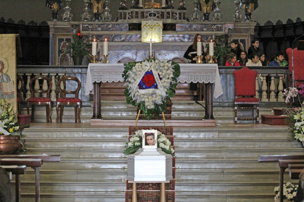 I Gonfaloni listati a lutto campeggiano ai dati dell’altare, di fronte a cui è posizionato il feretro bianco del piccolo Marco. In mezzo all’altare spicca invece una corona di fiori con scritta in italiano e slovacco (la nazionalità della madre, ndr).