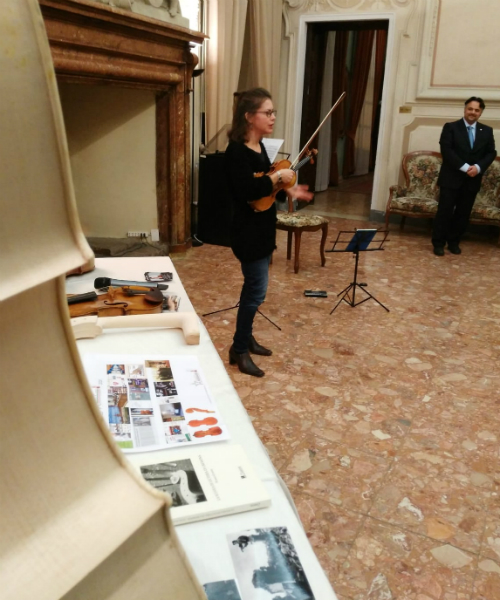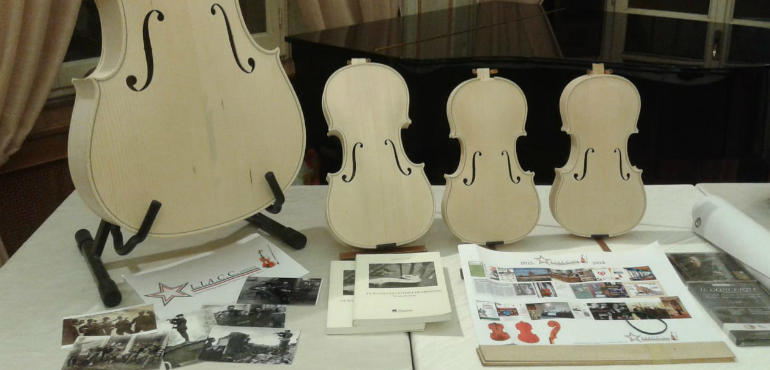 Ospite d’onore della serata è stata la liutaia cremonese Yael Rosenblum, diplomata in viola con il massimo dei voti presso l’Israel Arts and Science Accademy e diplomata col massimo dei voti alla Scuola Internazionale di liuteria “Antonio Stradivari” di Cremona. Yael Rosenblum ha illustrato alle autorità militari presenti le fasi di costruzione degli strumenti ad arco offrendo esecuzioni musicali su uno degli strumenti da lei realizzati. Per concludere le celebrazioni del centesimo anniversario della fine della Prima Guerra Mondiale, il prof. Fabio Perrone, ha intrattenuto gli ospiti raccontando frammenti di storia di liutai italiani che, per età anagrafica, si sono trovati a vivere il conflitto della Prima Guerra Mondiale: da Giuseppe Lecchi, soldato semplice, a Paolo De Barbieri, che durante il servizio militare svolto in Marina costruiva chitarre per i commilitoni imbarcati; da Nicola Utili, soldato semplice che realizzerà un violino con le allegorie della Grande Guerra, a Simone Ferdinando Sacconi; da Pietro Gallinotti, prigioniero deportato in Russia, a Gaetano Sgarabotto, radio-telegrafista e direttore della banda militare di Mirafiori; da Vincenzo Calace ad Ansaldo Poggi a Gaetano Pollastri a Carlo Bisiach. Il prof. Perrone ha mostrato ai presenti un violino realizzato dal liutaio milanese Antonio Monzino (1885-1918), caporale del Battaglione Aviatori di Torino presso il Comando Militare dell’Aerodromo di Mirafiori, caduto nella Prima Guerra Mondiale.
