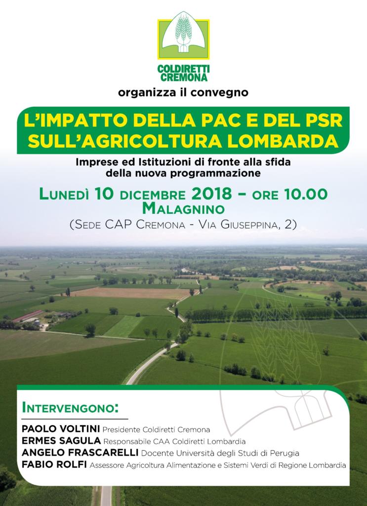‘L’impatto della Pac e del Psr sull’agricoltura lombarda: Imprese ed Istituzioni di fronte alla sfida della nuova programmazione’. E’ il tema dell’incontro organizzato da Coldiretti Cremona per lunedì 10 dicembre a Malagnino, alle ore 10.00 presso la sede del Consorzio Agrario (in via Giuseppina 2), con Fabio Rolfi Assessore Regionale all’Agricoltura, Paolo Voltini Presidente di Coldiretti Cremona e del Cap Cremona, Ermes Sagula responsabile Caa Coldiretti Lombardia e Angelo Frascarelli esperto di politiche comunitarie e docente all’Università degli Studi di Perugia.