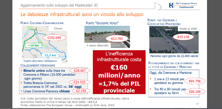 Il territorio cremonese sconta un deficit di 160 milioni di euro all’anno a causa dell’inefficienza infrastrutturale di strade, ferrovie e trasporti in generale. Il calcolo viene dallo Studio The European House Ambrosetti presentato al Tavolo infrastrutture (facente parte del Tavolo Competitività) di mercoledì 5 dicembre in Camera di Commercio su iniziativa del presidente della Provincia di Cremona Davide Viola. Una seduta straordinaria al fine di creare un momento di concertazione e confronto tra gli attori del territorio provinciale, in merito ai temi caldi in ambito infrastrutturale in vista dell’incontro con il Presidente di Regione Lombardia Attilio Fontana.