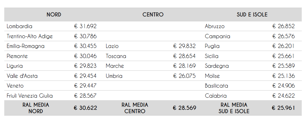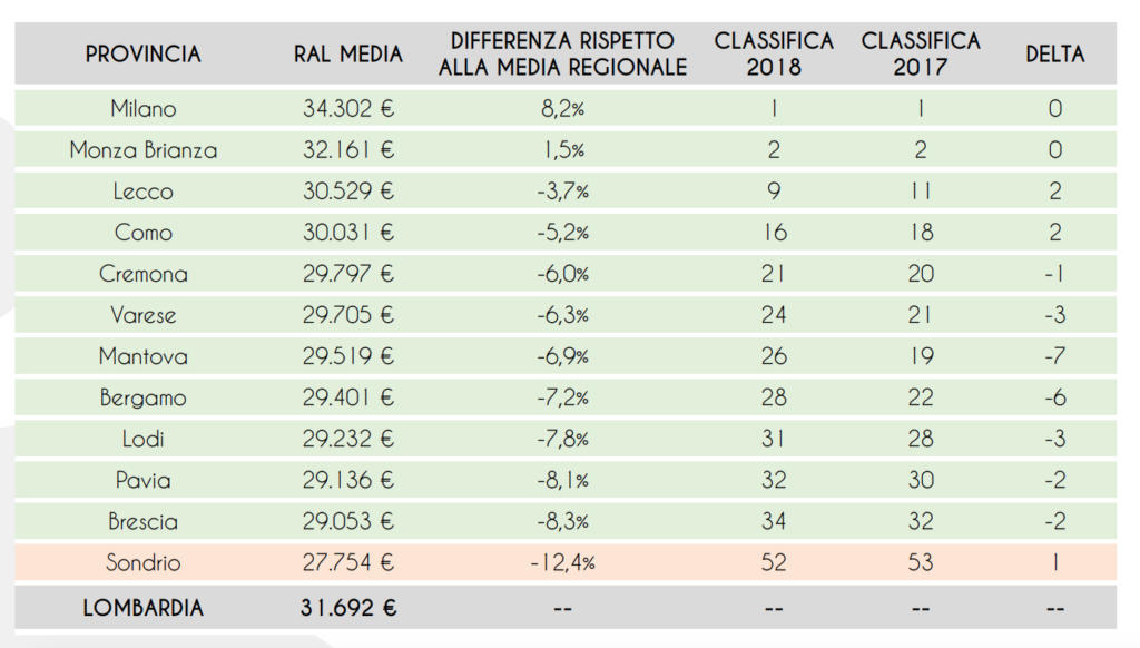 Tornando a Cremona, il nostro territorio si pone leggermente al di sopra della media nazionale (29.358), ma inferiore del 6% rispetto alla media regionale. Tuttavia, la provincia risulta essere la quinta in Regione, dopo Milano, Monza e Brianza, Lecco e Como. In ogni caso, tutte le province lombarde, ad eccezione di Sondrio, si posizionano nella fascia di merito più alta (su un totale di 3, ndr) permettendo alla Lombardia di primeggiare tra le Regioni con una RAL di 31.692. L’Italia, secondo il Report, si può considerare spezzata in tre tronconi: tra Nord e Sud ci sono circa 5mila euro di RAL media di differenza (30.622 contro il 25.961 del Meridione, isole comprese), con il Centro a posizionarsi a metà strada (RAL media di 28.569). Segnali di ripresa da parte del Sud, in ogni caso ci sono Matera (+12 posizioni rispetto allo scorso anno) e Bari (+ 7). Male per quanto riguarda il Nord, Mantova, Piacenza, Vicenza, Savona, Imperia (-7) e Treviso (-8).