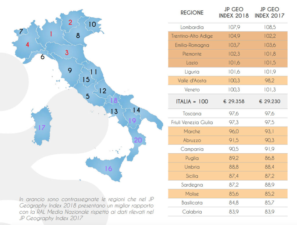 Il Report contiene la graduatoria retributiva delle 20 regioni italiane e la graduatoria delle 107 province, suddivise, come detto, in 3 fasce di merito. Il Geography Index 2018 si basa sulle rilevazioni effettuate dal sito www.stipendiogiusto.jobpricing.it tra il 2014 e il 2018. Le classifiche sono state elaborate tenendo esclusivamente come riferimento la RAL. Per ottenere la retribuzione media di ogni provincia si è considerata la composizione di Dirigenti, Quadri, Impiegati e Operai all’interno della provincia stessa, ottenuta tramite l’elaborazione dei Dati Trimestrali sulle Forze di Lavoro (fonte Istat).