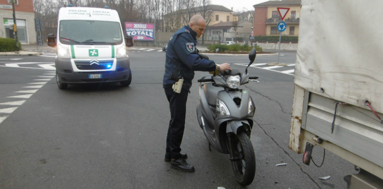 Questa mattina, mercoledì 2 gennaio, intorno alle 10.35 in via Castelleone 2 un autocarro Iveco, feramtosi per concedere la precedenza a due pedoni in procinto di attraversare la carreggiata sulle strisce pedonali, è stato tamponato da un ciclomotore. Il conducente del motorino è quindi stato trasportato al Pronto Soccorso su un’ambulanza con ferite lievi. Il ciclomotore è rimasto gravemente danneggiato mentre sono pressoché nulli i danni all’autocarro. I rilievi sono stati effettuati dalla Polizia Locale.