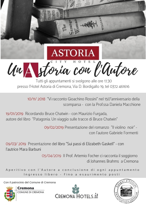 Il 19 Gennaio alle ore 17.30, presso l’hotel Astoria di Cremona, in via Domenico Bordigallo 19, si terrà il secondo appuntamento della rassegna ‘UnAstoria con l’Autore’, ideata e curata da Emanuela Riverso in collaborazione con CremonaHotels.it e Luoghi d’Autore e con il patrocinio del Comune di Cremona. L’evento, dal titolo ‘Ricordando Bruce Chatwin’, sarà dedicato allo scrittore e giornalista inglese trenta anni esatti dalla sua scomparsa, avvenuta a Nizza il 18 gennaio 1989. Il suo celebre libro ‘In Patagonia’, che ha venduto alla sua uscita mezzo milione di copie nella sola Inghilterra, ha reso Chatwin il simbolo stesso dell’uomo moderno che cerca nel viaggio una via di fuga. Ospite del pomeriggio presso l’Hotel Astoria sarà quindi lo scrittore Maurizio Furgada, autore del libro ‘Patagonia. Un viaggio sulle tracce di Bruce Chatwin’, a cui nel 2012 è stato assegnato il Premio Letterario-Editoriale ‘L’Autore’. A condurre l’incontro ci sarà il critico letterario Claudio Ardigò. Fugarda vive a Cremona ed è laureato in Giurisprudenza, ha vinto il Premio Annuale per la Pace 1999 della Regione Lombardia con un progetto interetnico di formazione alla pace nella Bosnia del post-conflitto, oltre, come detto, ad aver ricevuto il premio ‘L’Autore’.