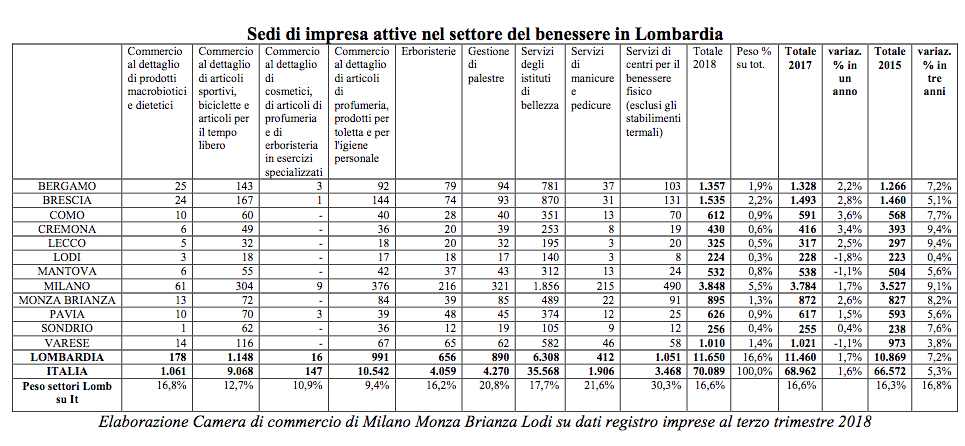 Dopo i pranzi di Natale, i cenoni di Capodanno e i dolci della Befana, si torna in forma. Sono quasi 12mila le imprese attive nel settore del benessere e fitness in Lombardia nel 2018, in crescita del 2% in un anno e del 7,2% in tre, per un giro d’affari di 5 miliardi di euro all’anno. Tra le prime dieci province italiane figurano tre lombarde: Milano con 3.848 imprese, il 5,4% nazionale (+9,1% dal 2015), al secondo posto per attività dopo Roma ma prima per giro d’affari, circa 3 miliardi di euro e per numero di addetti, oltre 19 mila. Brescia è sesta con 1.535 imprese (+5,1% in tre anni) e Bergamo settima con 1.357 (+7,2%). La Lombardia pesa soprattutto nel settore delle palestre, concentrando il 21% delle attività italiane, nei centri benessere (30%) e nei servizi di manicure e pedicure (22%) e di bellezza (18%). Forte anche la presenza di imprese lombarde nel settore del commercio di prodotti macrobiotici e dietetici (178 sedi di impresa su 1.061 in Italia, il 17% del totale). E’ quanto emerge da un’elaborazione della Camera di commercio di Milano Monza Brianza Lodi su dati registro imprese al 2018, 2017 e 2015.