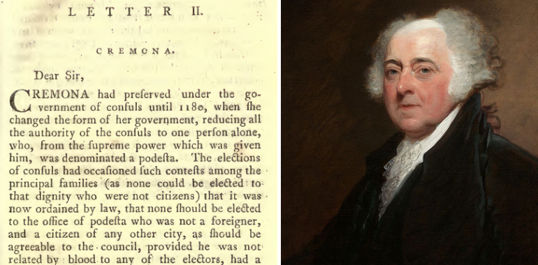 “Per la storia del medioevo cremonese chiedere al signor John Adams, Presidente degli Stati Uniti”. Questa frase, paradossale sotto diversi punti poteva essere tranquillamente pronunciata da uno degli addetti alla Casa Bianca quando, tra il 1797 e il 1801, nella neonata Casa Bianca a Washington arrivò come primo inquilino e secondo presidente della storia americana, il signor John Adams. Padre fondatore degli Stati Uniti, vicepresidente degli Stati Uniti sotto George Washington, John Adams era anche un grande storico, fatto che rendeva il suo profilo da statista ancora più raffinato.