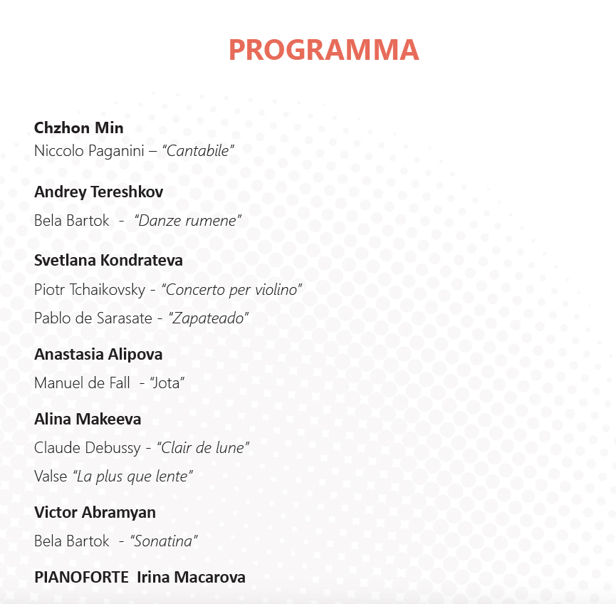 Dopo la pausa del periodo natalizio e di fine anno, la rassegna torna quindi con un appuntamento molto speciale in programma domenica 13 gennaio, alle ore 11.00, nella Sala Manfredini del Museo Civico ‘Ala Ponzone’. Si tratta del concerto ‘Musica in amicizia da Mosca a Cremona’ con la classe di violino del professor Victor Abramyan della Scuola Centrale Musicale di Mosca presso il Conservatorio Tchaikovsky. E’ questa una delle più famose e prestigiose istituzioni scolastiche del mondo musicale russo (e non solo), fondata nel 1935 su iniziativa di Alexander Goldenweiser. La scuola è un’istituzione speciale, dove si educano i giovani talenti provenienti da ogni angolo della Federazione Russa. I ragazzi studiano sia le materie di cultura generale, sia la musica a 360 gradi. In questa prestigiosa istituzione si sono diplomati Maxim Vengerov, Leonid Kogan, Vladimir Ashkenazi, Vladimir Spivakov e Denis Matsuev.