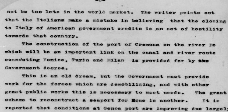 All’interno della profonda analisi di Page sull’enorme valore (potenziale e molto spesso teorico ovviamente) delle infrastrutture italiane compare il porto di Cremona, per il quale viene spiegato come il progetto di sviluppo sia legato alla crescita del porto di Genova. Woodrow Wilson viene informato direttamente dall’Italia del fatto che, come stimolo al finanziamento americano dell’opera, il progetto di costruzione del porto fluviale cremonese è stato inserito in un decreto legge, per cui la movimentazione di merci da Torino a Venezia sarà molto più semplice e meno costosa. L’ambasciatore Page, storicamente innamorato del Bel Paese, si “sbraccia” telegraficamente con la Casa Bianca – quasi a difendere fino all’ultimo le scelte italiane – affermando che l’Italia si sta mobilitando per ripartire e ricostruire “nodi industriali” come quello di Torino e Milano, ma che la situazione politica sempre più fragile impedisce di fare progetti di lungo periodo.