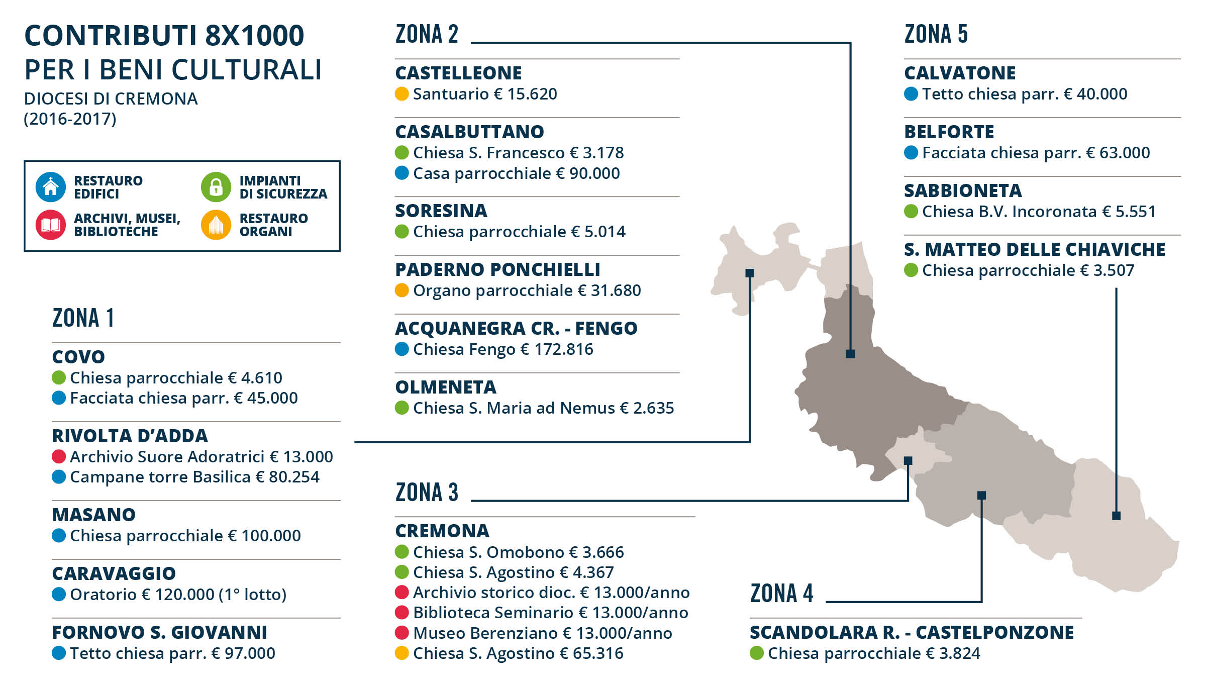 A segnalare i contributi è il sito della Diocesi, che stila una mappa delle azioni di recupero: tetti, facciate e campanili delle chiese parrocchiali e dei santuari, impianti di sicurezza e videosorveglianza, contributi per l’allestimento dei musei, la manutenzione delle biblioteche, la conservazione degli archivi e ristrutturazione o nuove realizzazioni di oratori (dai fondi per l’edilizia di culto sono arrivati circa 950 mila euro per quello di Castelleone dal 2013 e poco più di 200 mila dal 2014 per quello di Torre de’ Picenardi, mentre a Caravaggio si attendono i contributi per il secondo e terzo lotto di lavori).