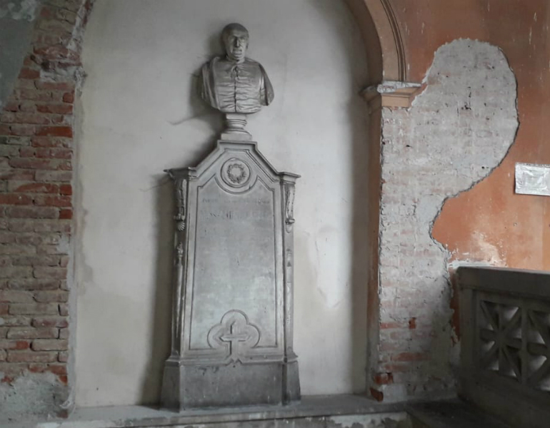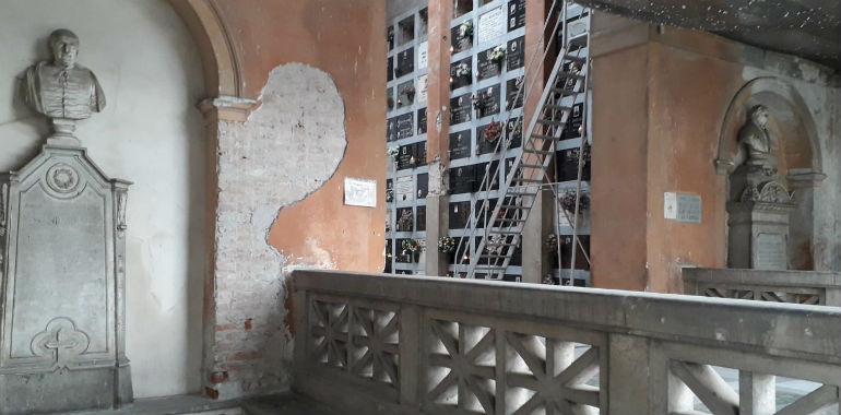 Potrebbero arrivare presto tempo migliori per almeno alcuni dei monumenti e delle lapidi del Cimitero di Cremona, un enorme patrimonio, sia pubblico che privato che necessita di costante manutenzione. Muffe, muschio, naturale deterioramento dei materiali, acqua piovana stanno rendendo irriconoscibili alcuni ricordi legati alla storia di Cremona e tra questi ci sono i due busti con lapide di Alessandro Gallina e Luigi Voghera – sacerdote tra i primi a realizzare asili infantili in Italia e architetto il secondo – che si trovano seminascosti in un’ala di uno degli androni a crociera. Due nicchie che hanno subito le ingiurie del tempo e delle infiltrazioni d’acqua, tanto che le iscrizioni, di epoca ottocentesca sono illeggibili: del tutto quelle del primo, quasi del tutto, nel secondo caso.