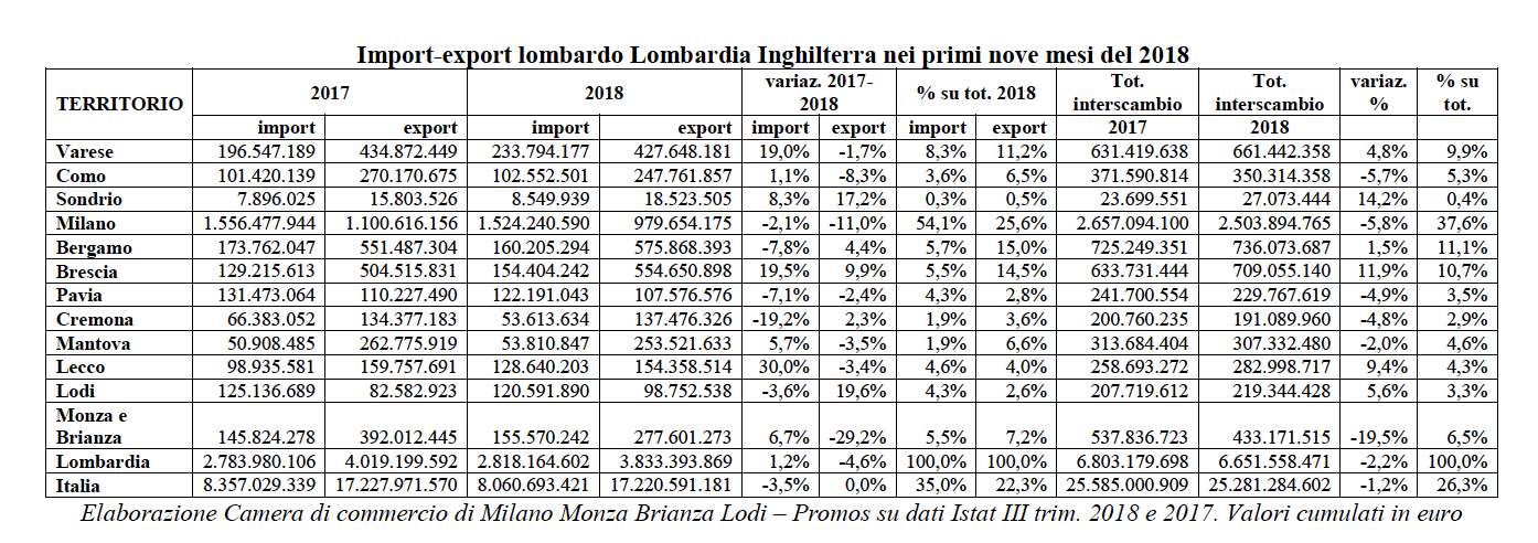 Nonostante il tema Brexit sia sempre sul tavolo – in questi giorni in modo particolare – non dovrebbero esserci grosse ripercussioni sul business con il Regno Unito. L’interscambio italiano con la Gran Bretagna, infatti, supera oggi i 25 miliardi di euro: 17 miliardi di export e 8 di import. Tra Lombardia e il Regno Unito, invece, il giro di affari è di 6,7 miliardi nei primi nove mesi del 2018, il 26,3% del totale italiano, di cui 3,8 miliardi di export e 2,8 di import. E’ quanto emerge da un’elaborazione della Camera di commercio di Milano Monza Brianza Lodi e della sua azienda speciale Promos per le attività internazionali sugli ultimi dati Istat a settembre 2018. Milano con 2,5 miliardi di scambi guida la classifica regionale, seguita da Bergamo e Brescia con oltre 700 milioni. Le crescite più consistenti a Sondrio (+14,2%) e Brescia (+11,9%).
