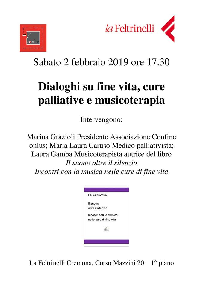 Sabato 2 febbraio alle 17.30 presso la Libreria ‘Feltrinelli’ di Cremona, in occasione della presentazione del libro ‘Il suono oltre il silenzio – Incontri con la musica nelle cure di fine vita’ sarà offerta l’opportunità ai partecipanti di dialogare sui temi del fine vita e delle cure palliative, oltre che sul valore dell’utilizzo della musicoterapia in contesti di cura come l’Hospice. Interverranno Marina Grazioli, Maria Laura Caruso e Laura Gamba. Grazioli è Presidente Associazione ‘Confine – offrire cittadinanza al dolore’, che si propone di sostenere chi sta vivendo un dolore, una perdita, un lutto, attraverso percorsi di elaborazione individuali e di sostegno in piccolo gruppo. Caruso, medico palliativista con molti anni di esperienza in Hospice e nella assistenza domiciliare dei malati terminali, attiva in contesti ospedalieri e di volontariato. Gamba, infine, è Musicoterapista professionista ed autrice di vari libri tra cui proprio ‘Il suono oltre il silenzio’, volume che raccoglie dodici anni di esperienze ed incontri nei luoghi destinati alle cure palliative. “In un momento – spiega la stessa autrice – in cui si torna a parlare di fine vita e di legge sul testamento biologico il libro offre uno spunto di riflessione sul significato e il valore che possono assumere la musica e la musicoterapia in Hospice soffermandosi su tematiche fondamentali inerenti il fine vita”.