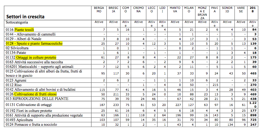 A livello regionale, invece, in forte crescita la coltivazione di piante tessili (da 7 a 84, +50%, con picchi di 21 a Milano e 16 a Como), le spezie (da 113 a 139, +23%, con oltre 20 a Brescia, Bergamo e Pavia), gli ortaggi protetti (da 156 a 175, +12%) e in piena aria (da 1.169 a 1.220, +4%), i frutti oleosi (da 443 a 469, +6%), gli alberi da frutta (da 421 a 465, +11%), la riproduzione di piante (da 417 a 438,+5%), l’allevamento di bufali (da 378 a 403, +7%), i servizi di supporto agli agricoltori (da 876 a 898, +3%).Bene anche il riso (da 248 a 270, +9%). L’apicoltura con +2,3% tocca le 725 imprese. Bene i fiori, + 4%, con 177 attività.