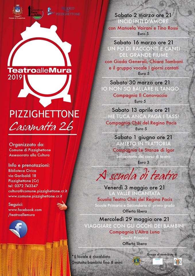 Dal 2 marzo riparte a Pizzighettone la rassegna ‘Teatro alle Mura’, inaugurata nel 2013 grazie a un’idea di Stefano Vanelli. L’edizione 2019 prevede sette appuntamenti, distribuiti tra il 2 marzo e il 1° giugno: quattro spettacoli vedranno sul palco varie compagnie del territorio, uno sarà l’evento finale del locale corso di teatro per adulti, mentre due saranno i saggi dei giovani attori dei laboratori teatrali della Scuola primaria e della Scuola Teatro ‘Chèi del Regina Pacis’ (Primaria e Secondaria di primo grado).