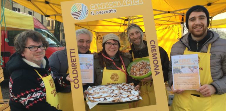 Stamattina, giovedì 28 febbraio, a Pizzighettone, all’ombra della Torre del Guado, le aziende agricole protagoniste del mercato di Campagna Amica hanno reso omaggio al carnevale, offrendo ai cittadini una degustazione di dolci tipici (lattughe, castagnole, frittelle) e colorando i gazebo gialli della Coldiretti con un arcobaleno di stelle filanti. E’ questa l’iniziativa ‘Cibo in maschera’, che sta portando la festa di carnevale sui mercato di Campagna Amica in tutta Italia, dalla Capitale (sabato 2 marzo, a Roma nel mercato di via San Teodoro, è prevista la prima sfilata nazionale dei dolci di Carnevale) a Milano (da domani al mercato coperto di Porta Romana ci saranno degustazioni di dolci tipici e laboratori a tema dedicati ai bambini).