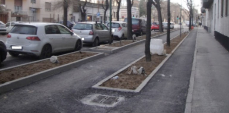 “Innanzitutto la verifica sul posto per delineare il tracciato della pista ha evidenziato che la sosta a pettine, prevista nel progetto esecutivo, avrebbe limitato sensibilmente la sicurezza dei mezzi in fase di parcheggio, obbligandoli a compiere manovre sulla sede stradale” spiega Manfredini. “La nuova disposizione, condivisa con la Polizia Locale, riduce drasticamente il pericolo potenziale e permette la messa a dimora delle piante già presenti. Il numero di stalli non ha subito variazioni, in quanto l’inclinazione poco accentuata (30° circa) ha permesso, durante la delineazione del tracciato, il raggiungimento del giusto equilibrio. Il tracciato della pista, per quanto riguarda il tratto dove sono presenti attività commerciali e pubblici esercizi, è stato reso semplicemente più razionale, così da evitare che, in fase di manovra, le auto possano intralciare il transito dei ciclisti”.