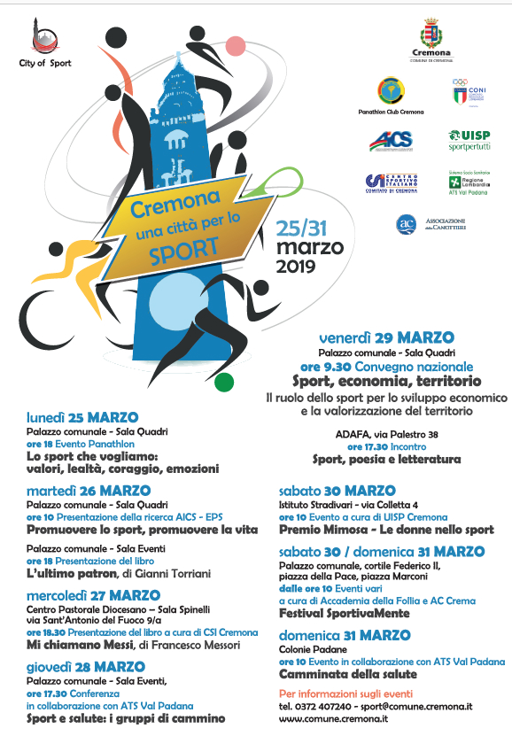 Una dei momenti importanti in questa settimana sarà l’attribuzione del Premio ‘Atleta cremonese nel mondo’, che da alcuni anni non veniva più assegnato. Le iniziative sono state illustrate da Torresani che ha coinvolto i singoli organizzatori a spiegare nel dettaglio i contenuti, a partire dal prologo di questa settimana, con l’iniziativa del 16 marzo ‘Attenzione …. si balla!!!’ organizzato dall’Associazione Italiana Dislessia. Altro appuntamento di rilievo il 29 marzo la Nazionale a cinque, Campione del mondo, incontrerà la U. S. Cremonese. Da non perdere inoltre ‘Tutti in campo in piazza Marconi’, che si terrà domenica 31 marzo, alle 10.45 grazie al forte e “pazzesco” impegno dispiegato e dall’Accademia della Follia. In chiusura Segalini ha tenuto a sottolineare l’importanza di questo progetto, auspicando che possa diventare un appuntamento annuale.