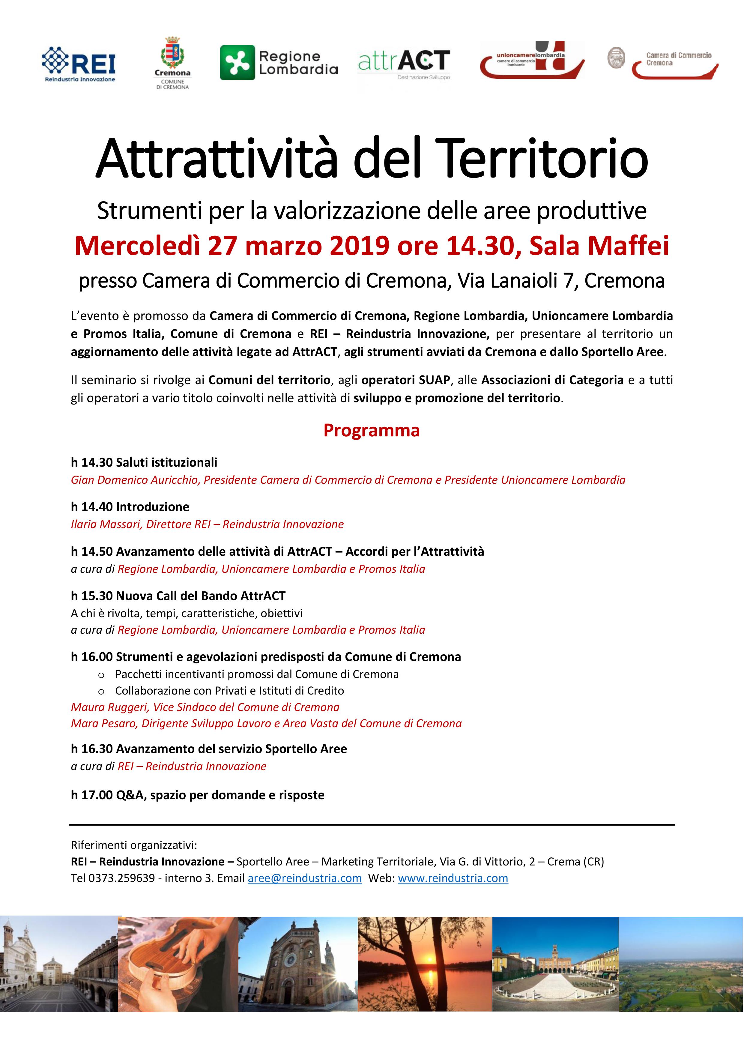 Nel contesto delle attività di valorizzazione e sviluppo del territorio, Camera di Commercio Cremona, Regione Lombardia e Unioncamere Lombardia con Promos Italia, REI- Reindustria Innovazione promuovono l’ incontro ‘Attrattività del Territorio- Strumenti per la promozione delle aree produttive’ che si terrà mercoledì 27 marzo alle 14.30 in Sala Maffei presso la Camera di Commercio di Cremona (ingresso Via Lanaioli 7): l’incontro è rivolto ai Comuni, le Associazioni di Categoria e gli Enti Terzi . Questo appuntamento, fanno sapere da REI, vuole “poter essere un momento di restituzione al territorio dell’esperienza del Bando AttrACT, da parte di Regione Lombardia e di Unioncamere Lombardia con i referenti di Promos Italia, bando che ha permesso la sottoscrizione dell’ accordo da parte di 5 Comuni della Provincia di Cremona (Capergnanica, Casalmaggiore, Cremona, San Bassano e San Giovanni in Croce)”.