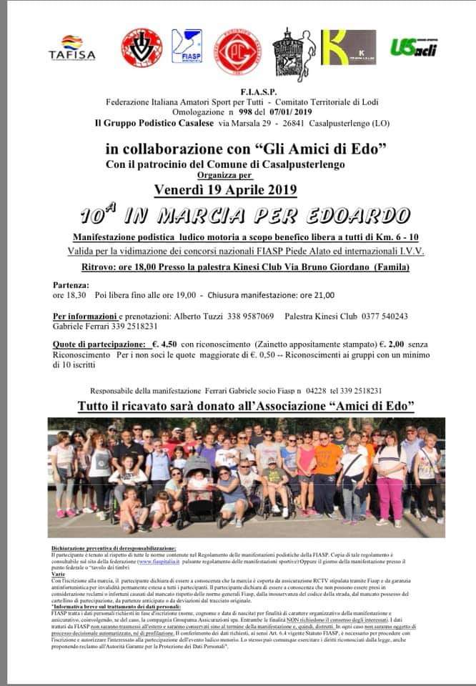 Si svolgerà venerdì 19 aprile la decima ‘In marcia per Edoardo’ organizzata dall’associazione ‘Gli Amici di Edo’ con il patrocinio del comune di Casalpusterlengo (Lodi). Nonostante si svolga in territorio lodgiano, l’associazione opera sul territorio di Pizzighettone dal 2009 a sostegno di ragazzi con disabilità e delle loro famiglie. La finalità è quella “di valorizzare le persone diversamente abili e di prevenire l’isolamento delle famiglie che convivono con la disabilità e tutto ciò si concretizza in una rete di volontariato, di aiuto, di presenza, anche quotidiana, a favore di alcuni ragazzi e giovani con disabilità”. Trattandosi di una onlus, i fondi raccolti vengono devoluti annualmente per progetti, acquisto di ausili e di attrezzature, per i singoli ragazzi o per soddisfare piccole richieste degli istituti scolastici che li accolgono. Proprio la marcia per Edo, un ragazzo con disabilità che vive nel borgo, è l’attività principale che permette all’associazione di raccogliere fondi. “Grazie ad alcuni sponsor – sottolineano Gli Amici di Edo -, anche pizzighettonesi, la marcia viene organizzata a costo zero per l’associazione in collaborazione con la palestra Kinesi Club di Casalpusterlengo. Il ritrovo è previsto alle 18.00 proprio presso la palestra (via Bruno Giordano), con la partenza libera che è prevista tra le 18.30 e le 19.00. La manifestazione è infatti podistica ludico motoria e prevede due percorsi: da 6 e da 10 km. L’evento è comunque valido per la vidimazione dei concorsi nazionali FIASP Piede Alato ed internazionali I.V.V. La quota di partecipazione varia dai 2 ai 4,50 euro, con una maggiorazione di 50 centesimi per i non iscritti.