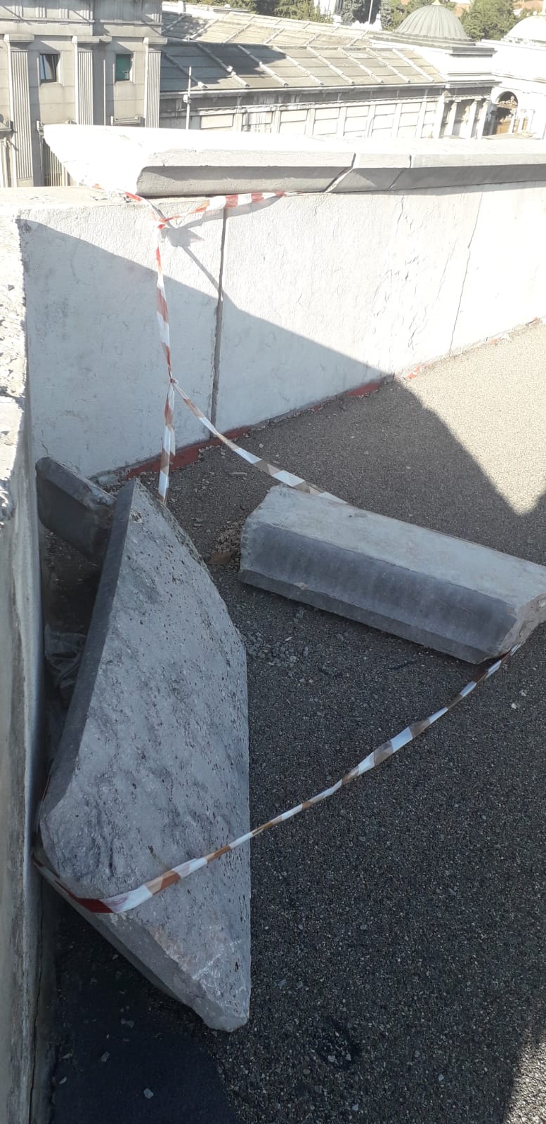 AGGIORNAMENTO – E’ stato un atto vandalico, a determinare il distacco del pesante parapetto sulla sommità del cavalcavia del cimitero. Il fatto sarebbe avvenuto un quindicina di giorni fa e il ripristino è subordinato all’approvazione della Soprintendenza.