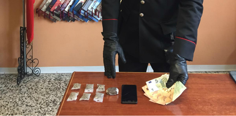 Giunti a casa sua, tuttavia, i militari hanno eseguito una perquisizione, trovando, nascosto in un barattolo sopra un comodino della camera da letto, un involucro di cellophane contenente 25 grammi di hashish e 6 bustine termosaldate di marijuana per un peso complessivo di 15 grammi, già pronte per lo spaccio al dettaglio. C’era poi materiale vario per il confezionamento delle dosi, 2 telefoni cellulari e la somma di euro 500, provento dell’attività di spaccio.