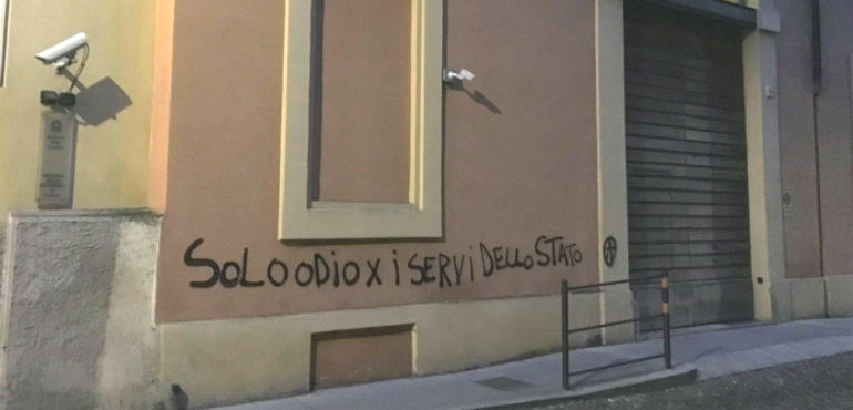 Scritte nell'atrio della banca e sui muri della procura. Sotto accusa 27enne del Kavarna