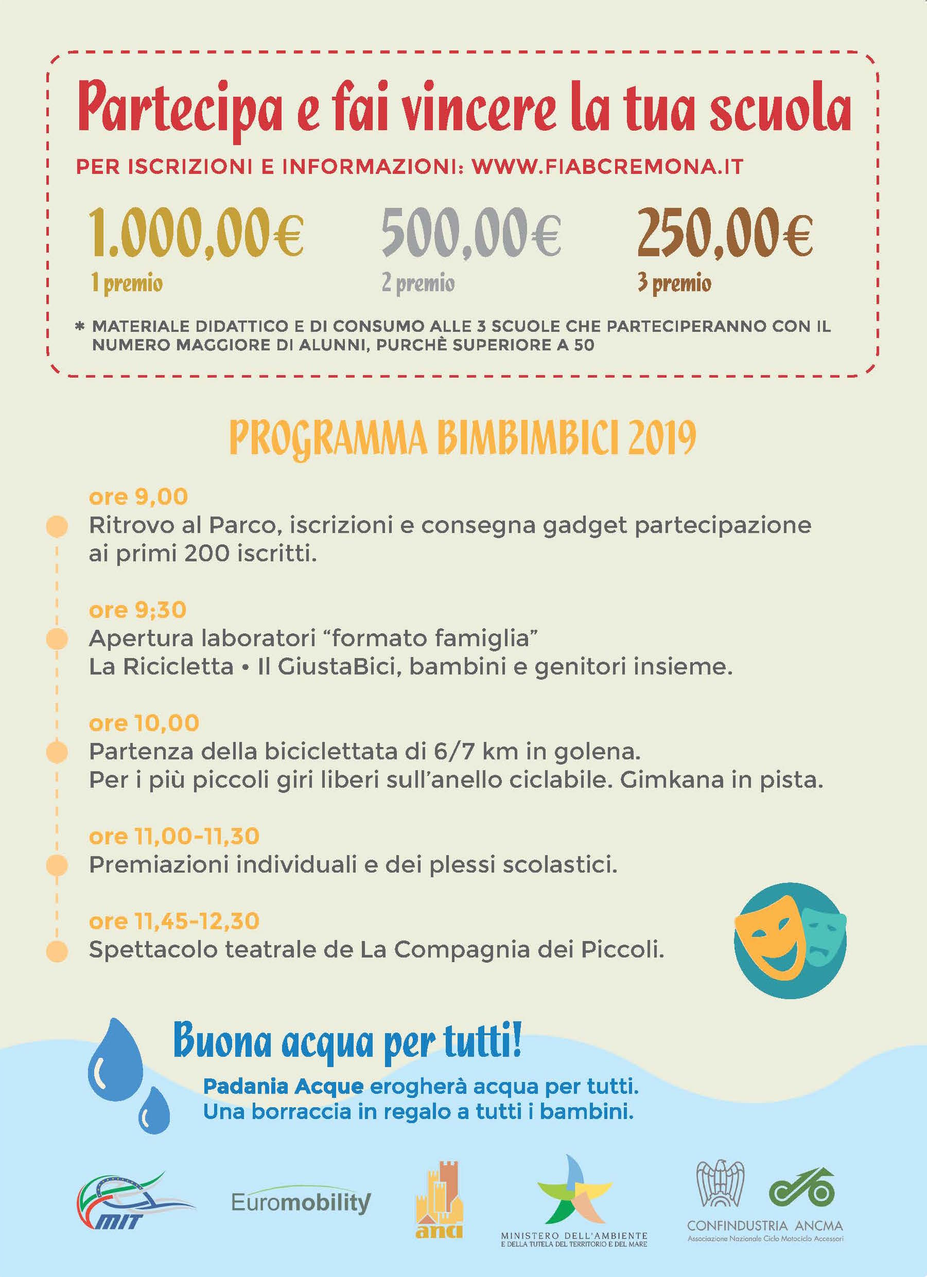 Fiab Cremona, metterà in palio premi consistenti per le scuole che porteranno il maggior numero di alunni (almeno 50): 1.000 euro alla prima, 500 alla seconda e 250 alla terza, per l’acquisto di materiale didattico di consumo e di libri. Ciò è reso possibile anche grazie alla condivisione dei nostri valori ed alla disponibilità di due importanti partner: Didattica Dante e Libreria Timpetill.