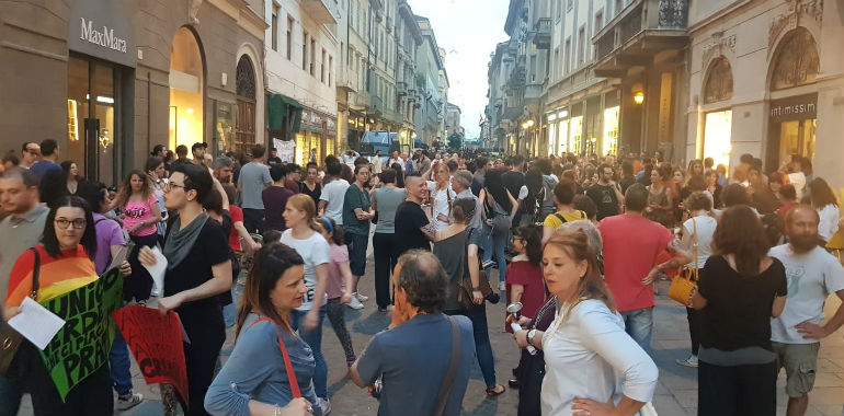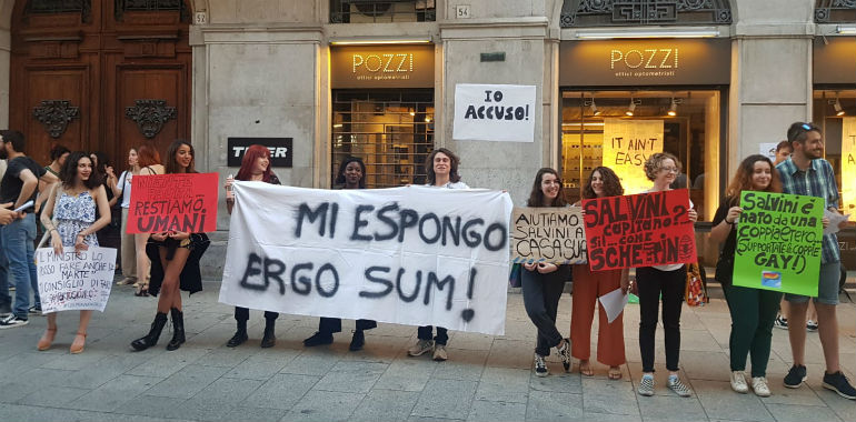 “Cremona non si lega” e “Io accuso” sono invece i concetti distintivi adottati dal gruppo apolitico e apartitico, composto in gran parte da studenti delle superiori e universitari, che ha organizzato il presidio in corso Campi / via Palestro durante il comizio di Salvini in piazza Roma. “Niente paura, restiamo umani”, “Salvini è nato da una coppia etero – supportate le coppie gay”; “L’unico verde che ci piace è quello sui prati”, le scritte che compaiono su alcuni cartelli.