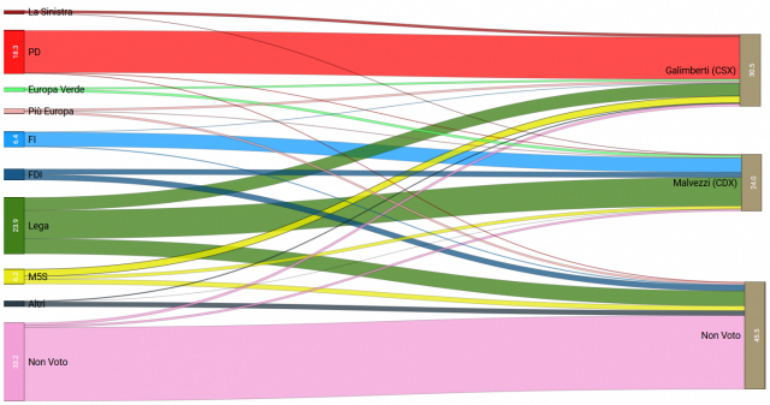 “Il diagramma di Sankey – scrivono i ricercatori della Luiss – mostra in forma grafica le nostre stime dei flussi elettorali fra europee e ballottaggi a Cremona. A sinistra sono riportati i bacini elettorali del ballottaggio, a destra quelli delle europee. Le diverse bande, colorate in base al bacino di provenienza delle europee, mostrano le transizioni dai bacini delle politiche a quelli delle regionali. L’altezza di ciascuna banda, così come quella dei rettangoli dei diversi bacini elettorali all’estrema sinistra e destra, è proporzionale al relativo peso sul totale degli elettori”.