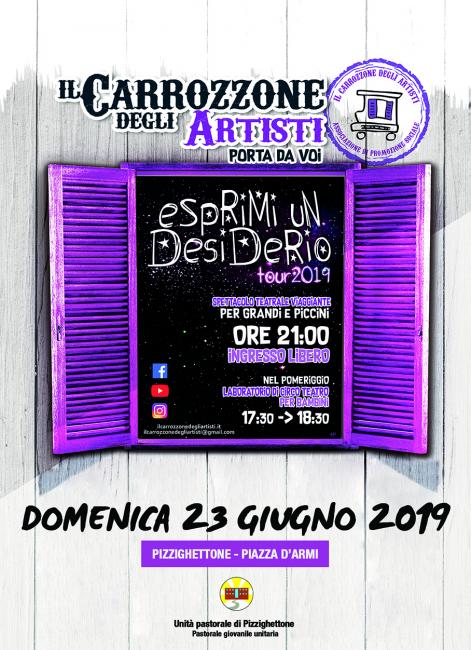 La Pastorale Giovanile dell’Unità Pastorale di Pizzighettone, con il patrocinio del Comune di Pizzighettone, organizza per domenica 23 giugno in piazza d’Armi lo spettacolo ‘Esprimi un desiderio’, tenuto dalla compagnia teatrale ‘Il Carrozzone’, composta da attori professionisti, attori dilettanti e ragazzi disabili che provengono da diverse cooperative della zona.