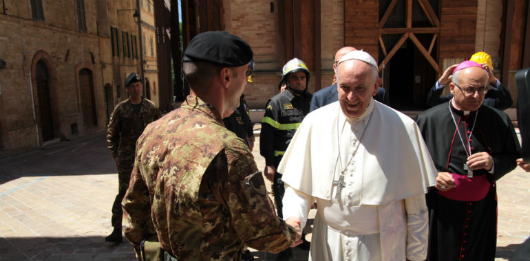 Si è svolta sotto la guida operativa dei militari del 10° Reggimento Genio Guastatori di Cremona, di stanza alla Col di Lana, la visita di Papa Francesco a Camerino, domenica scorsa. L’evento, organizzato dalla diocesi di Camerino-San Severino Marche, ha visto la partecipazione di migliaia di fedeli, molti dei quali sono giunti nella piazza del Duomo, adiacente alla zona rossa presidiata dai militari dell’Esercito, per assistere alle celebrazioni. Il Santo Padre, dopo aver officiato la Santa Messa e recitato l’Angelus domenicale, ha voluto attraversare la zona rossa, coincidente con il centro storico, visitando in ultimo la chiesa di “Santa Maria in via”, gravemente danneggiata dal terremoto.