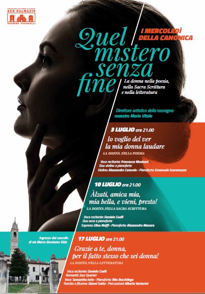 Gli incontri, curati dal direttore artistico Mario Vitale e intitolati ‘Quel mistero senza fine’, saranno dedicati alla donna nella poesia, nella Sacra Scrittura e nella letteratura, con letture recitate e intermezzi musicali. Tutti gli appuntamenti si terranno alle ore 21 presso la parrocchia (ingresso dal cancello di via Marco Gerolamo Vida).