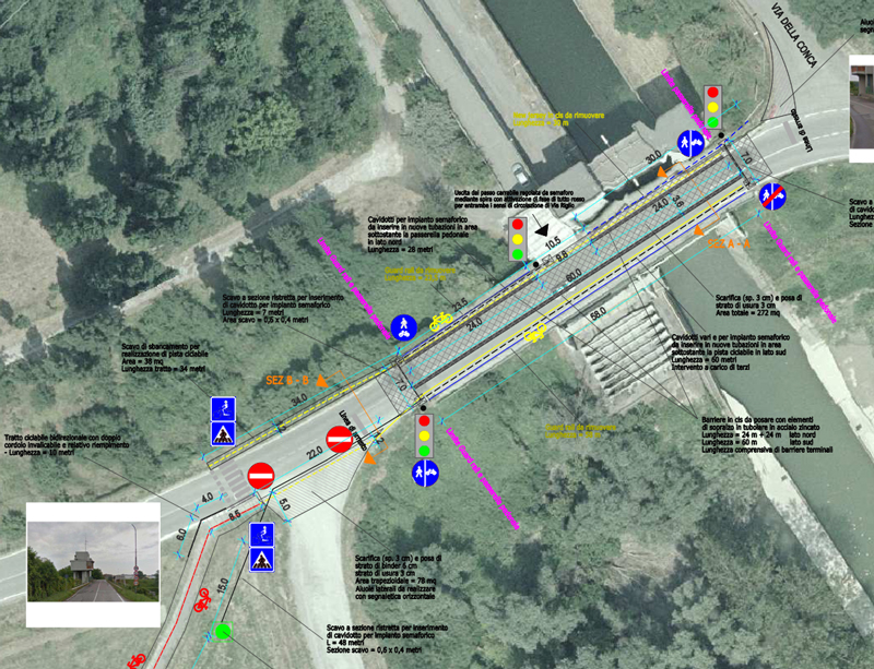 Il progetto prevede l’installazione di un impianto semaforico per la gestione di un senso unico alternato sul ponte delle chiuse del Porto Canale, così da regolamentare il traffico veicolare, e la realizzazione appunto della pista ciclo pedonale, in sede separata, ricavata su parte dell’attuale carreggiata del ponte. Il transito dei pedoni sarà garantito dai percorsi su passerelle esistenti e protette a lato della carreggiata