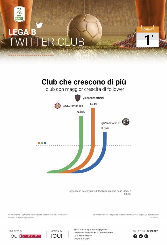 Ma a testimoniare l’entusiasmo dei tifosi cremonesi è certamente il dato riguardante l’engaging e la crescita dei follower sulla piattaforma. In entrambi i casi, la Cremonese si piazza al secondo posto in tutta la Serie B. L’engaging registra le interazioni generate dai tweet del club grigiorosso e pone la società di via Postumia dietro solo al Cosenza. Inoltre, la crescita dei follower nell’ultima settimana certifica la grande attesa generata dalla squadra di Massimo Rastelli dopo una campagna acquisti importante ed un precampionato, tra amichevoli e Coppa Italia, ricco di soddisfazioni. Il +0,88% degli ultimi sette giorni è inferiore solo, ancora una volta, al dato fatto registrare dal Cosenza (+1,04%).