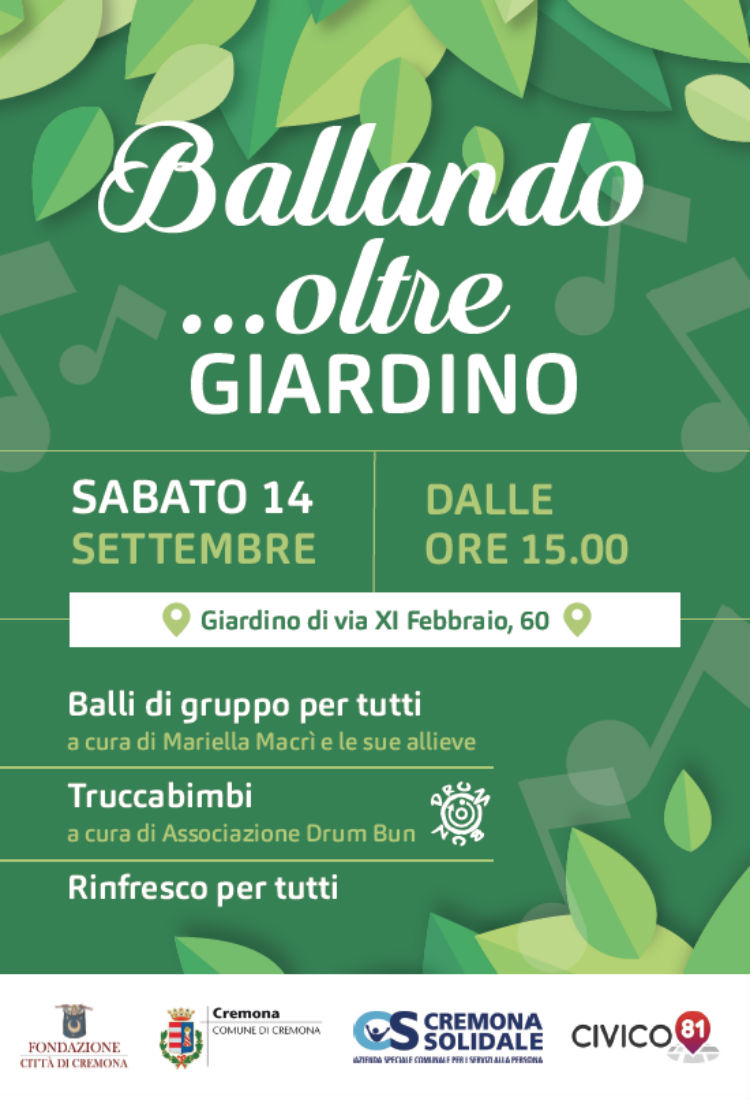 Inizierà questo sabato, 14 settembre, il ricco programma per rilanciare dopo la pausa estiva, il Giardino di via XI febbraio 60 nella rinnovata veste di parco aperto al pubblico, grazie alla collaborazione tra Fondazione Città di Cremona, Civico 81, Cremona Solidale e Comune di Cremona. Nel pomeriggio, con inizio alle 15, si danzerà con Mariella Macrì e le sue allieve, offrendo a tutti i partecipanti l’occasione di cimentarsi con i balli di gruppo attraverso lezioni guidate. Grazie al gruppo Drun Bum e alla cooperativa Nazareth ci si potrà divertire con il trucca-bimbi e il trucca-donne.