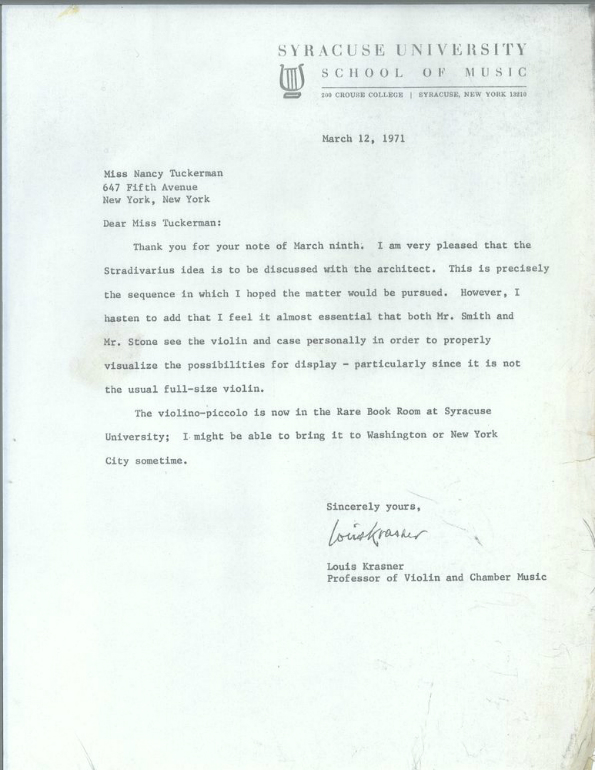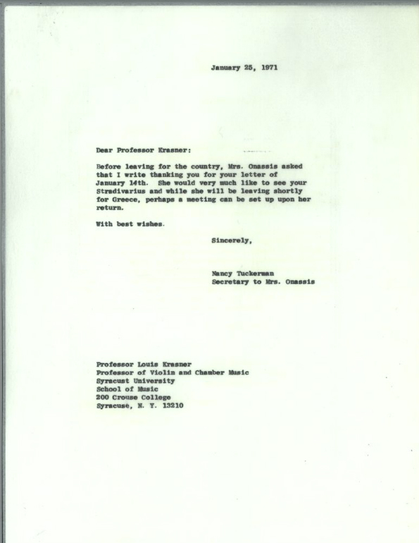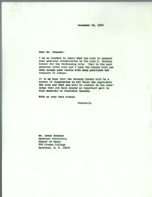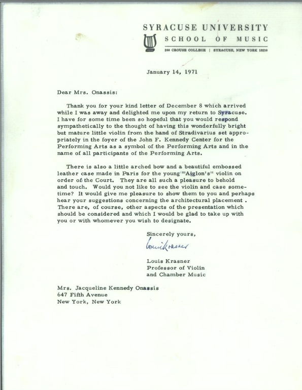 Nel 1971 il memoriale viene inaugurato con mostre, collezioni e sale da concerto ma per Jackie l’opera non era completa se non con la presenza di un violino “made in Cremona”. Amante della musica fin da bambina Jackie letteralmente “aprì” la Casa Bianca a concerti e alla musica nel senso più ampio del termine, restando sempre legata al concetto che i violini migliori al mondo fossero quelli prodotti all’ombra del Torrazzo. Nella sua corrispondenza personale compare la necessità di arricchire il Kennedy Center con uno strumento cremonese e, per ovviare alla ferma necessità della ex ma ancora amatissima first lady, arriverà la risposta di Louis Krasner, violinista statunitense di origine ucraina e docente di violino presso la scuola di musica della prestigiosa Syracuse University. Krasner ai tempi risultava come l’unico proprietario di una chitarra Stradivari, per cui propone a Nancy Tuckerman, la fidatissima segretaria personale di Jackie, di trovare un violino Stradivari per completare il percorso artistico del Kennedy Center voluto dalla first lady.
