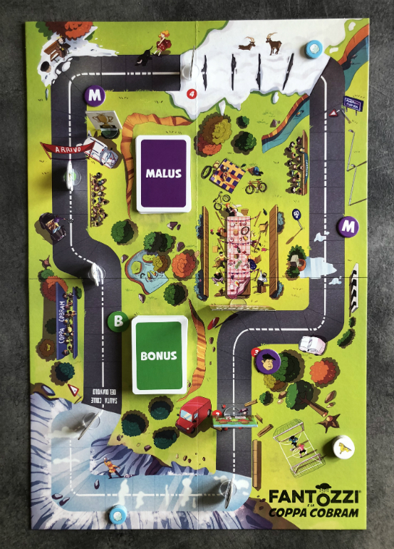 “Fantozzi e la Coppa Cobram” è un’esperienza tragicomica in cui i giocatori (da 2 a 5, ma è possibile anche giocare in solitario) devono superare una serie di ostacoli lungo il percorso e tagliare il traguardo per primi, acclamando così i famosi 92 minuti di applausi. Durante la corsa i giocatori interagiranno tra loro compiendo scorrettezze di ogni tipo, quindi aspettatevi tavoli ribaltati in casa o in ludoteca…le vostre amicizie saranno davvero messe a dura prova”.