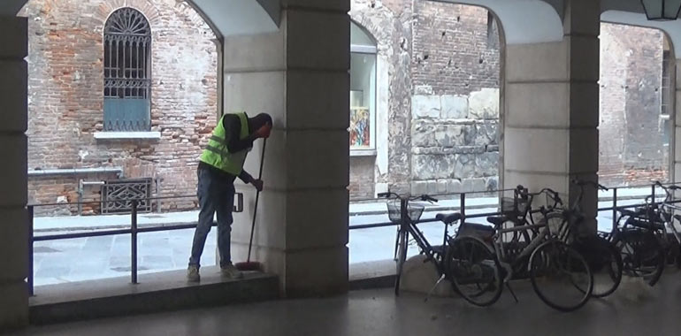 Iniziata la pulizia dei portici della Camera di Commercio. Di buon’ora quattro operai muniti di scope, aspirapolveri e stracci hanno delimitato la zona, hanno montato il ponteggio e hanno iniziato a pulire, via la polvere e le ragnatele dai soffitti, e poi nel corso dell’operazione sono state ripulite le lampade e anche il pavimento che versa in una situazione di degrado dovuto anche al guano dei piccioni. Ripulita anche l’edicola, chiusa da anni, che in un secondo tempo sarà rimossa. Una zona molto trascurata, questa, così vicina a piazza del Duomo che finalmente verrà almeno recuperata dal punto di vista della pulizia. Dunque si metterà al fine a quell’incuria in cui versa da anni. La riqualificazione delle gallerie sono uno dei punti del programma del sindaco Gianluca Galimberti.
