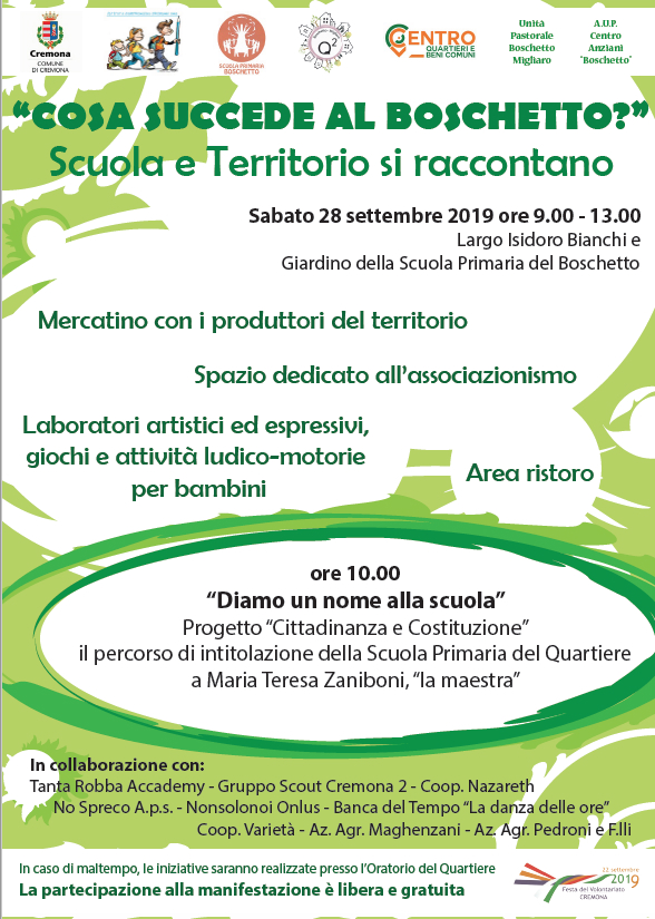 ‘Cosa succede al Boschetto? Scuola e territorio si raccontano’. Questo il titolo della festa che si terrà sabato 28 settembre, dalle 9 alle 13, i piazza Isidoro Bianchi e nel giardino della Scuola primaria al Boschetto (in caso di maltempo l’iniziativa si svolgerà all’oratorio). L’iniziativa, promossa dal Comitato di Quartiere 2 Boschetto–Migliaro e dalla Scuola primaria del Boschetto promuovono, è supportata dall’oratorio dell’Unità Pastorale Boschetto-Migliaro e dal Centro Anziani ‘Boschetto’ dell’A.U.P. (Associazione Unitaria Pensionati), costituisce un momento di animazione reso possibile grazie alla partecipazione attiva di realtà presenti nel quartiere o in maniera significativa nei contesti di vita dello stesso ma anche di altre realtà cittadine. Si tratta, tra l’altro, di un’occasione, per la comunità, di socializzare, di incontrare il mondo dell’associazionismo, di rappresentare la propria comunità in un racconto a più voci.