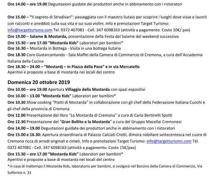 La manifestazione inizierà con l’apertura del Villaggio della Mostarda e del Palamostarda nei Giardini Pubblici di Piazza Roma, dove non mancheranno le iniziative dedicate ai visitatori di tutte le età tra cui show cooking, degustazioni, musica dal vivo, laboratori per bambini Mostarda Kids e talk show. Principale novità di questa edizione del Festival della Mostarda è la partnership con Explora e InLombardia che offrirà ai visitatori l’opportunità di scoprire il patrimonio artistico e culturale di due mete imperdibili della regione e di ricevere un timbro sul Passaporto #inLombardia. L’edizione 2019 si tingerà anche di verde. Per la prima volta ERSAF (Ente di Regione Lombardia per i Servizi all’agricoltura e alle Foreste) partecipa al Festival della Mostarda. Accogliendo la richiesta pervenuta dalla Camera di Commercio di Cremona, fornirà una ventina di piante alle iniziative in programma proprio a Cremona. Sarà un vero e proprio ‘bosco della mostarda’ dove nei giardini di Piazza Roma accanto al Palamostarda, si potranno ammirare gli alberi da frutto di pere e mele. Una presenza importante questa perché gli arbusti conservati oggi nel vivaio di Curno (BG) gestito da ERSAF, provengono dal sito di EXPO MILANO 2015.