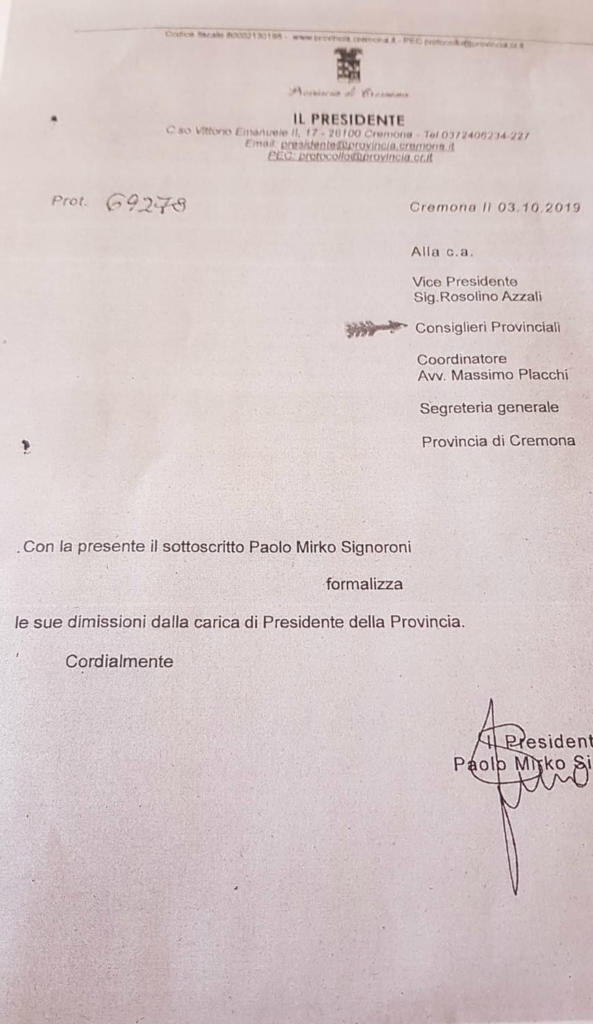 Ha scelto di dimettersi ancora prima del pronunciamento del Tribunale di Cremona a seguito del ricorso presentato e che potrebbe paralizzare l’ente per mesi. Mirko Signoroni, neo eletto presidente della Provincia di Cremona lascia la carica: “I miei principali obiettivi sono e rimangono quelli del buon andamento della Provincia e della tutela degli interessi del territorio, per questo mi dimetto. Questa scelta, molto ponderata, avviene anche a tutela della serenità e della piena operatività del Consiglio Provinciale”.