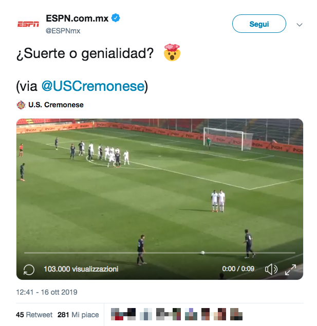 Fortuna o genialità? Così l’account Twitter di ESPN Messico ha condiviso il tweet della Cremonese che celebrava il gol di tacco di Antonio Caracciolo nell’amichevole contro la Pro Vercelli. Il video, realizzato dalla tv Cremona1 con il commento di Mauro Maffezzoni (guarda qui il gol), ha già raggiunto circa mezzo milione di persone. Perché oltre alle 100mila visualizzazioni su Twitter dall’emittente americana in circa 24 ore, ne vanno aggiunte altre 400mila fatte registrare dal nuovissimo account della Cremonese sul social network cinese Tik Tok. Il club grigiorosso, in ogni caso, non ha fatto mancare la sua risposta: ‘Genialidad y suerte se acompanan toda la vida’ (Genialità e fortuna si accompagnano tutta la vita, ndr). E, probabilmente, Caracciolo non credeva che un suo gol in amichevole potesse fare il giro del mondo in modo così virale.