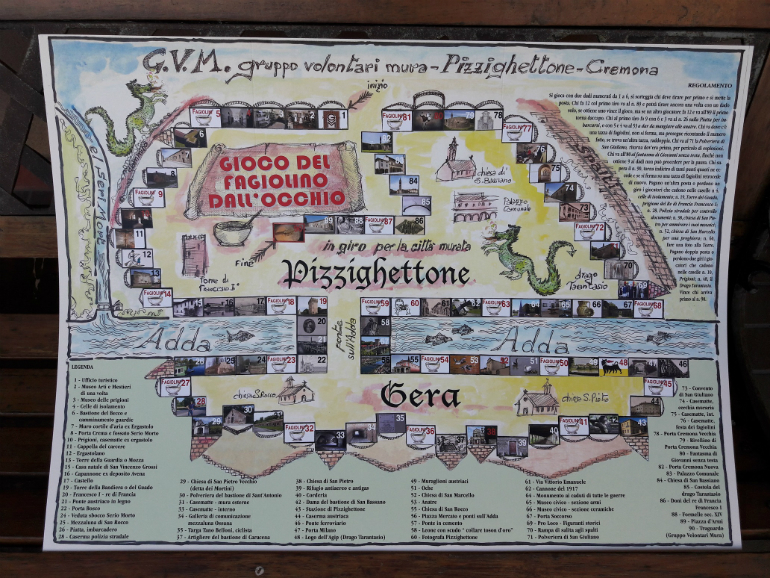 Si tratta insomma di un viaggio culturale con un gioco di società vecchia maniera in cui, casella per casella, si potranno conoscere – grazie anche afoto e disegni – tutti gli aspetti paesaggistici, storici e monumentali della città murata. Vince chi riesce per primo a fermarsi sulla casella col numero 90 dove bolle il pentolone di Fasulin de l’òc cun le cudeghe. Il progetto storico è stato curato da Gianfranco Gambarelli in collaborazione con l’arch. Giacomo Bassi, mentre la parte grafica da Amedeo Viciguerra. Il gioco sarà uno dei gadget della 27^ Fasulin de l’òc cun le cudeghe: si potrà trovare anche all’Ufficio turistico di piazza D’Armi al prezzo di 15,00 euro (mappa, segnalini, dadi e carte da gioco). Il ricavato verrà destinato al recupero e valorizzazione della cerchia muraria di Pizzighettone.