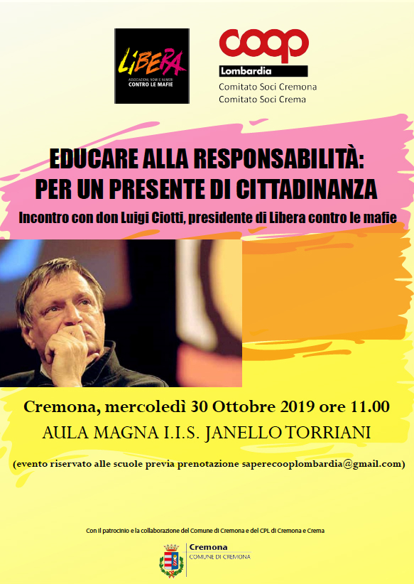 A conclusione del percorso di educazione alla legalità rivolto alle scuole e alla cittadinanza di Crema e di Cremona dal titolo ‘Quando la cooperazione diventa forza contro le mafie: scuole, istituzioni e società civile insieme per la legalità!’, mercoledì 30 ottobre alle ore 11.00 sarà ospite all’IIS J. Torriani di Cremona il presidente di Libera contro le mafie, don Luigi Ciotti. Titolo del suo intervento riservato alle scuole secondarie di secondo grado di Cremona, Crema, Casalmaggiore sarà ‘Educare alla responsabilità: per un presente di cittadinanza’.